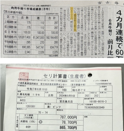 令和7年6月宮古家畜市場にて、ピンフの牛「福6の79」が全287頭中、落札価格1位となりました。
